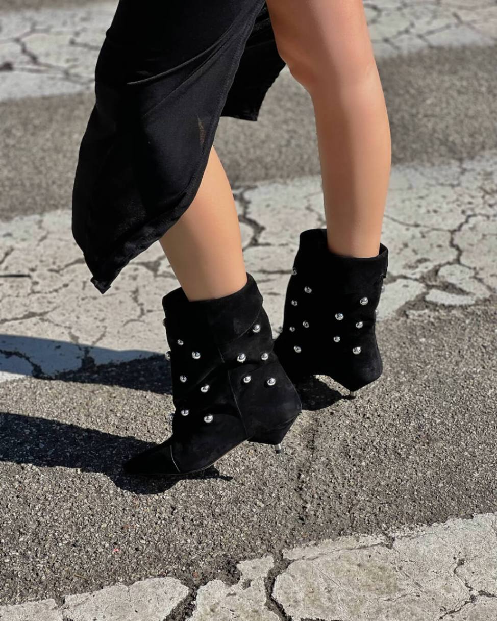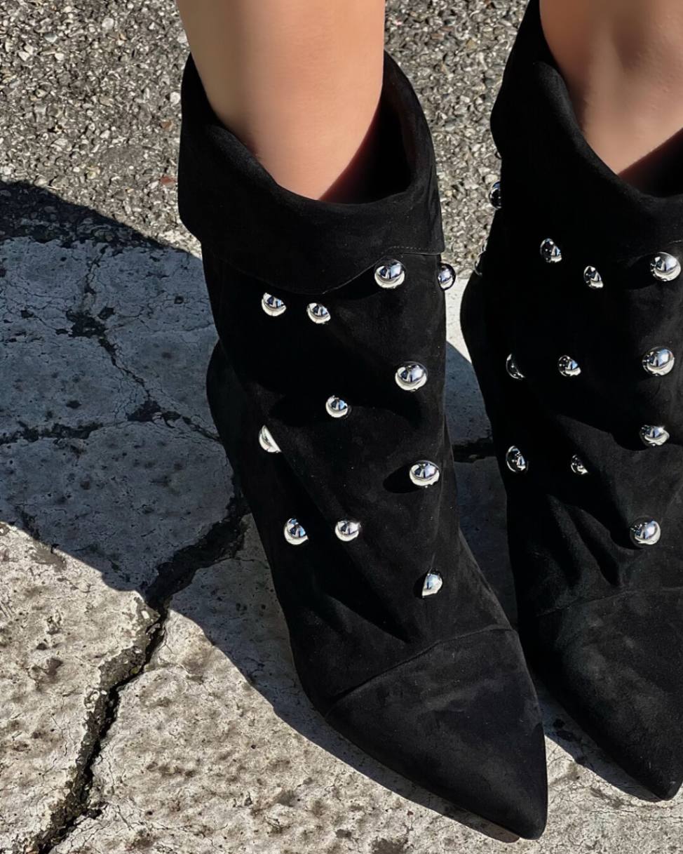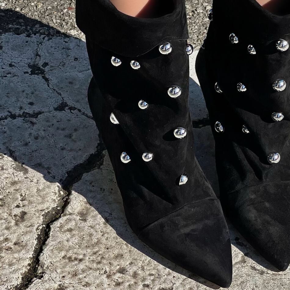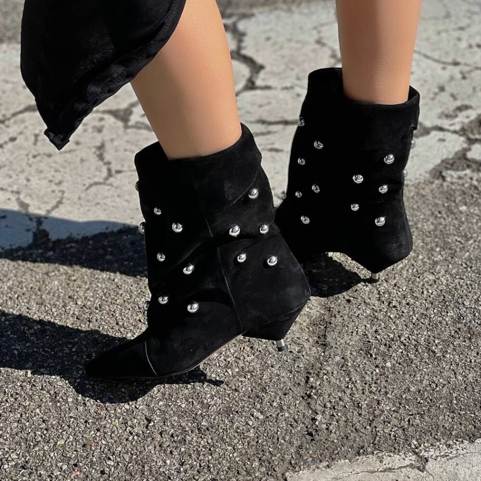 Tronchetto nero in camoscio, con interno in pelle, è un must-have per le donne chic e glam. La sua punta e le borchie grandi lo rendono unico e di tendenza. Inoltre, il tacco basso e il gambale morbido offrono comfort e stile!